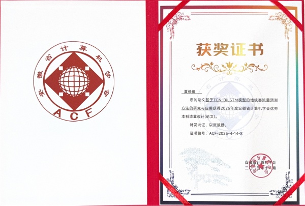 此外,大会还颁发了2025年度“安徽省计算机学会优秀青年科学家”、“安徽省计算机学会教学成果激励计划”、“安徽省计算机学会优秀博士学位论文”等奖项,以表彰在计算机科学领域做出杰出贡献的个人和团队。其中,我院获批《产教深度融合、协同育人:面向信创产业的“四链贯通”人才培养探索与实践》教学成果;2025届毕业生夏修倩的毕业论文《基于TCN-BiLSTM模型的地铁客流量预测方法的研究与应用》荣获“安徽省计算机学会优秀本科毕业设计(论文)”。