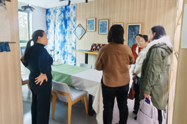 当日,在安徽鸿旭文化发展有限公司负责人的陪同下,城市建设学院院长及专业教师先后参观了企业文创空间、扎染实践区、沙龙活动场地等核心区域。企业方详细介绍了基地运营模式及内部空间,沙龙区域可容纳20余人开展交流活动,扎染等实践、展陈场地完备,为教学成果转化提供了良好基础。