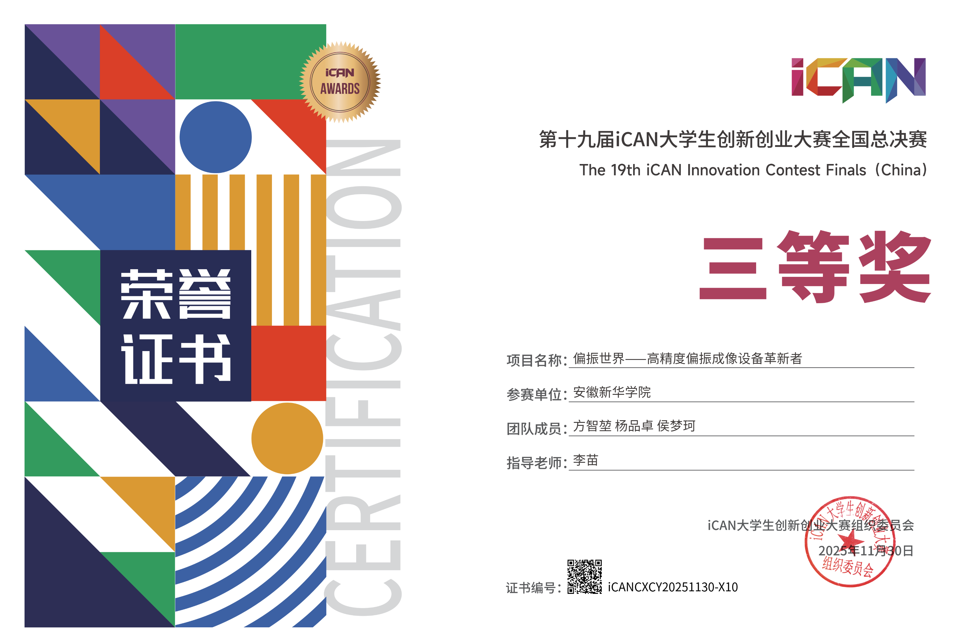 此次“偏振视界”团队斩获iCAN大赛国家级三等奖,不仅是beat365在线体育官网登录入口大数据与人工智能学院的骄傲,更是学校创新创业教育的又一重要里程碑。未来,学校将继续深耕创新创业教育,完善培养体系、搭建实践平台,助力学生成长为科创领域高素质人才,为国家创新发展提供更多人才支撑。