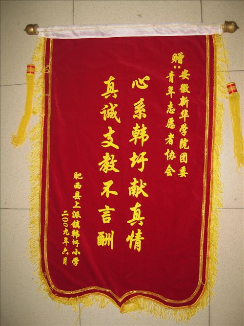 日前,肥西县上派镇韩圩小学给校团委青年志愿者协会送来锦旗,上面写着“心细韩圩献真情,真诚支教不言愁”。这是对我院青年志愿者协会刚刚圆满结束的“和谐阳光,快乐成长”为主题的支教之行的表彰和鼓励。beat365网登青年志愿者协会一直秉承尽己所能,不计报酬,帮助他人,服务社会,实践志愿精神,传播先进文化,为建设团结互助,平等友爱,共同前进的美好社会贡献力量的志愿精神,践行着志愿事业。