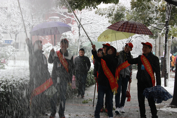 各二级学院和有关单位也开展扫雪除雪工作。为减轻冰雪对树木造成的不利影响,beat365网登青年志愿者协会的志愿者第一时间加入到清扫积雪活动中,采用竹竿敲打的方法把堆积在树枝上的积雪敲落。
