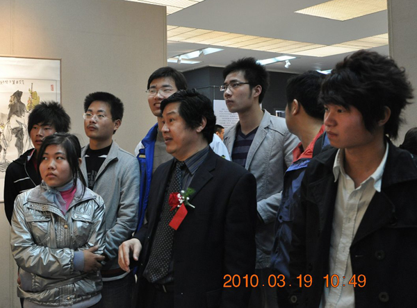 在展览馆,人文艺术学院艺术系副主任生动地给同学讲解着张先生的珍品,他说我们欣赏一幅作品,不光只停留在纸张给我们的视觉感受,更应该透过这幅作品去寻味作者的思想和境界。