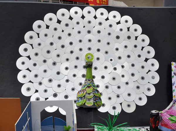 人文艺术学院团总支学生会在此次活动中倡导:微笑是语言,文明是信念,并以此为口号来展现人文学子文明礼仪的风采。在我院所展示的环保作品中,最吸引眼球的作品莫过于放置在展示台中央的孔雀开屏环保作品,孔雀的全身是有一百多个光碟构成,组成了孔雀开屏的美丽瞬间。这个作品既组成了一幅唯美的而环保展示图,也淋漓尽致的展示了我院学生会宣传主题的内涵。