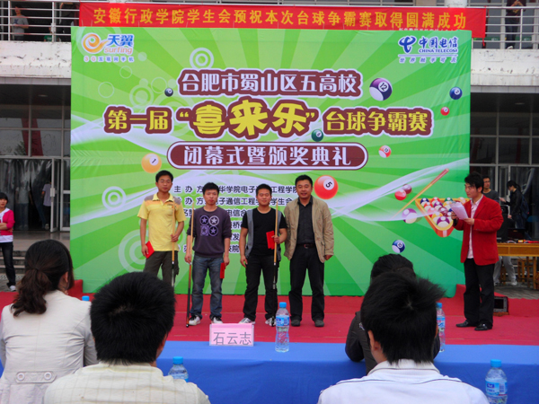 5月17日中午,由电子通信工程学院主办、院学生会承办以及各高校院系学生会协办的首届“喜来乐”台球争霸赛暨颁奖典礼在工大食堂广场成功举办。中国科技大学、安徽行政学院、安徽经济管理学院、安徽林业学院和我院的五所高校代表参加了比赛。