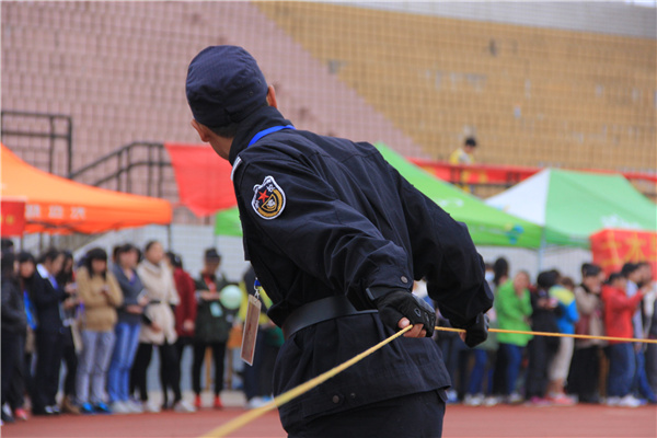 他们迎着冷风,整齐地站在跑道两边,兢兢业业,没有人叫苦叫累。在运动场上,他们坚守在自己的岗位上,维护赛场秩序,防止突发事件的发生。为做好此次运动会的护校工作,他们分成了两组,一组在体育场内,进行现场秩序维持工作;另一组在体育场外,负责校园各处巡逻,以防意外事件的发生。来自2014级动漫学院环境设计专业的王甜是运动场上护校队的一员,她说:“能够担任此次运动会的护卫人员,我感到非常光荣,我也会尽全力将本职工作做到最好,也希望每位运动员都能拿到最满意的成绩。”