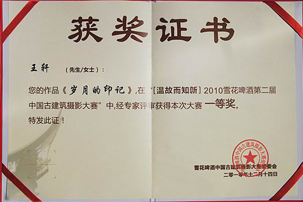 此次活动由雪花啤酒和清华大学建筑学院主办,历时三个月,得到了广大摄影爱好者和古建筑爱好者的积极参与和支持,共收到7万余幅参赛作品。最终在组委会的认真挑选中,共选出31幅获奖作品,安徽省共有三人获奖,我院学子王轩的作品《岁月的印记》成功入围并获得一等奖!