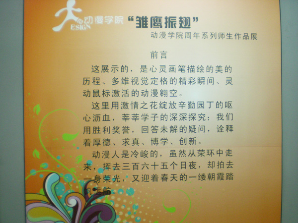 为庆祝动漫学院成立一周年,动漫学院全体师生集体创作了大量的优秀作品,从4月16日至5月22日陆续展出,其中平面类作品、摄影类作品、书法类作品、手绘类作品、立体构成类手工作品等将主要在动漫学院第一展厅和第二展厅展出。