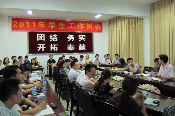 6月9日下午,学生处召开2011年度第三次学生工作会议布置期末相关工作,会议特别邀请了督查督导处处长吴宏东和教务处韦文莉老师出席会议,各二级学院行政副院长、行政秘书、学管秘书、辅导员代表及学生处全体人员参加。学生处处长朱兆健主持会议。
