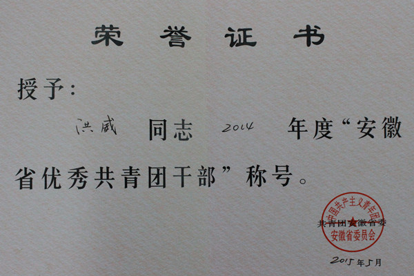 据悉,本届评选活动全省共有16名高校共青团干部荣获2014年度“安徽省优秀共青团干部”称号,洪威老师是唯一获此荣誉的民办高校共青团干部。