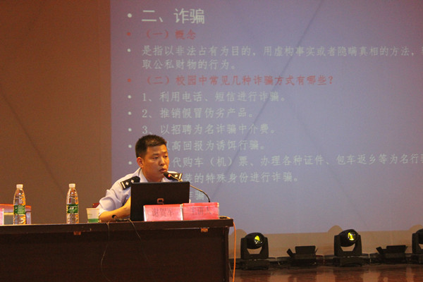 合肥市公安局高新分局谢贺军针对大学生人身安全与防范知识,讲述了如何防盗、防骗、防抢、防侵害、防意外事故、防止寻衅滋事、防网络犯罪七个方面的内容,并结合具体案例,使大家意识到自己平时不规范行为背后所隐藏的安全隐患。
