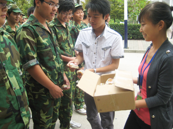 为使新生愉快地度过大学的第一个中秋节,在学校也能感受家一样的温暖。9月11日,药学院组织有关人员到新生军训场地开展中秋慰问活动,为新生送上了节日的祝福。