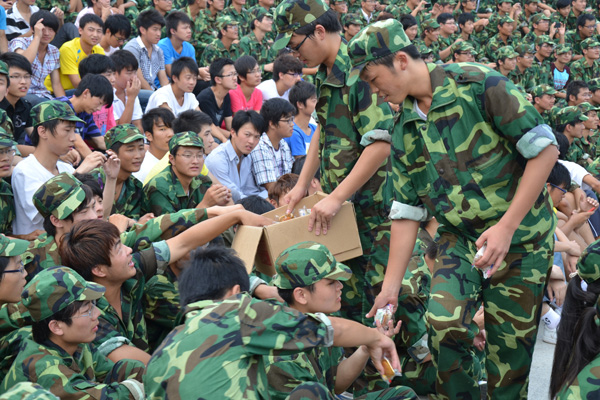 在激昂的军歌伴奏下,土木与环境工程学院2011级新生穿着整洁的军装,迈着整齐的步伐走进活动现场,分方阵就座,场面十分壮观。