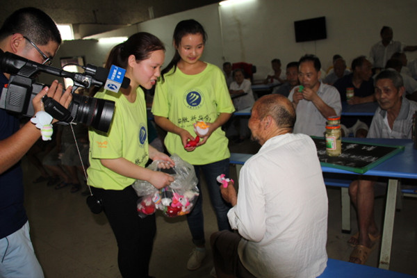 桐城市吕亭镇中心兴店敬老院是一所公益性福利单位,这里居住了50多名“五保户”孤寡老人。6月25日下午,实践队在敬老院开展了爱心送温暖活动,帮助老人们量血压,为老人们带来精彩的文艺节目,赠送了亲手制作的保健香囊,购买了罐头和健康知识宣传材料。宣城电视台对本次活动进行了现场采访。