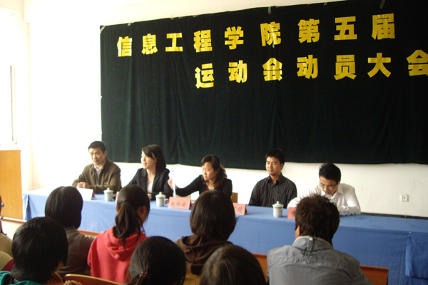发展体育运动,增强身体素质,对于推进学校各项工作的开展都具有十分重要的意义,是培养德、智、体、美全面发展的合格人才,推进学校建设、改革和发展的需要。10月初,在接到校运动会相关工作通知后,信息工程学院全院上下便立即着手各项准备工作。10月14日,信息工程学院召开全体教职员工会议,传达《关于举办第五届校田径运动会的通知》精神,动员教职员工积极参与。当天下午,学工口也通过专题会议,根据《信息工程学院第五届运动会工作方案》,具体布置该项工作。随后,各班级辅导员通过主题班会的形式宣传运动会召开的目的和意义,动员广大在校学生积极参与;学生会也通过召开各班级班长和体育委员会议,为运动会前期宣传做统一部署。经过一周的报名和筛选,最终确定了学生运动员代表90人、教职工运动员代表10人。10月21日中午,信息工程学院召开第五届运动会动员大会,行政副院长钱颜娇、全体学工人员、学生训练教练员参加了本次会议。钱颜娇在会上鼓励运动健儿们继续发扬“更快、更高、更强”的奥运精神,争取在本届运动会上再创佳绩。