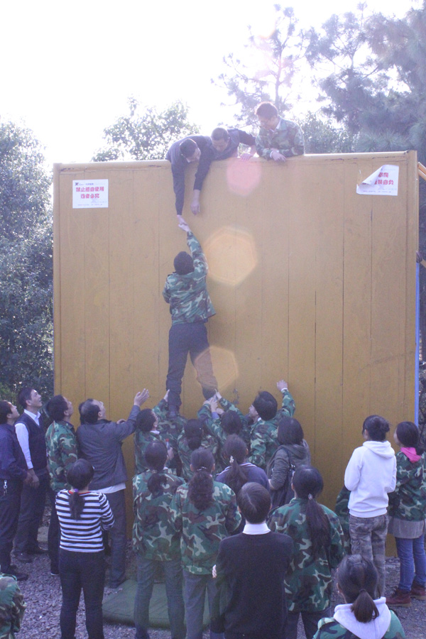 在一堵高4米的笔直墙面前,大家都觉得困难重重。突然,一位特别的教练——方达宪教授给我们指出方法——“搭人梯、造人墙”。大家按照这个方法齐心协力、各尽其责,最终每组队员都顺利地“毕业”。“翻越毕业墙”是对队员们意志的考验,使老师们认识到个人的成功永远基于集体的力量。