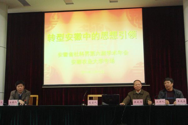 11月12日,思政部有关人员参加了由安徽省社科联与安徽农业大学主办的 “转型安徽中的思想引领”第六届学术年会安徽农业大学专场研讨会。安徽省社会科学界学术年会作为全省多学科、高层次、权威性、品牌化的学术文化交流平台,得到省委省政府充分肯定,社会认同度不断提高。本次年会是以邓小平理论和“三个代表”重要思想为指导,深入贯彻落实科学发展观,紧密联系安徽实际,加强基础研究,突出应用对策研究,营造宽松民主和谐的学术氛围,推进哲学社会科学理论创新,促进学术交流,展示最新科研成果的全省范围的学术研讨会。来自全省各高校、科研机构的90多位专家、学者和研究人员参加本次学术会议。