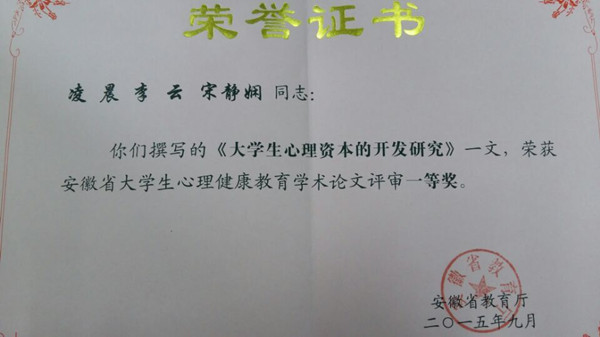 本网讯(通讯员:凌晨)日前,beat365网登心理老师凌晨、宋静娴共同撰写的论文《大学生心理资本的开发研究》在省教育厅举办的“大学生心理健康教育学术论文征集评选活动”中荣获一等奖。
