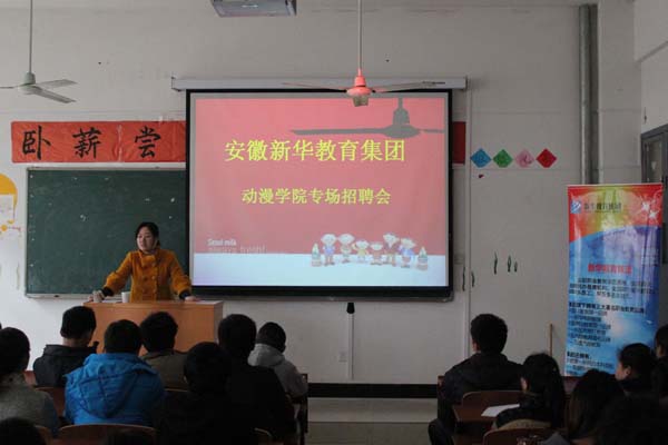 安徽新华教育集团是全国职业教育的示范基地,其下拥有新华电脑教育、万通汽修教育、新东方烹饪教育和新安驾校。本次教育集团人力资源部的周老师来动漫学院宣讲,并为全国新华电脑学院选聘优秀的动漫类教师。安徽新华电脑专修学院始建于1988年,是国家信息化教育全国示范基地。公司招聘人员给在场的学生介绍了学校的发展情况、业务范围、设备规模以及对未来的规划,并说明了岗位的需求和相关待遇。教育集团就业稳定性好、用人规范、学习提升空间大等优势吸引了许多应届毕业生前来应聘。招聘人员对毕业生们进行了现场测试,肯定了同学们的能力和学识,同时也对同学们提出了一些要求和建议,希望同学们在校期间要多实践,多创新,缩短与社会需求的差距。