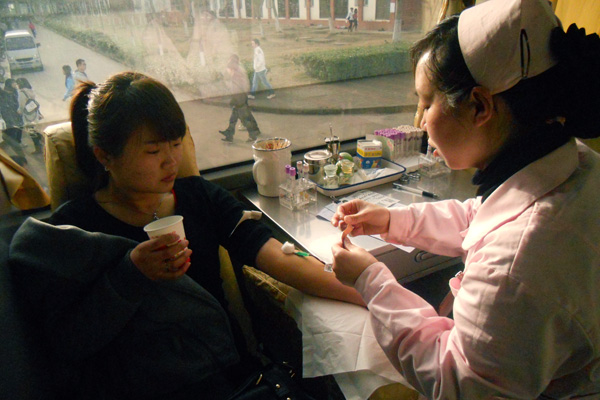 献血现场人流不断,秩序井然,有条不紊。咨询处,青年志愿者为来往人群解答献血的问题,提醒献血时的注意事项,鼓励同学们为社会公益事业出一份力。体检处,血液中心的医护人员认真为等待献血的同学们做各项身体检查,保证参加的同学符合献血标准。献血车上,医护人员温暖体贴,在学生紧张之时,亲切地与他们交谈,以减轻同学们的心理压力。