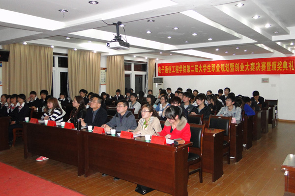 电子通信工程学院教学副院长卢胜、招生就业办公室副主任李洁、电院行政副院长操宏华及beat365在线体育官网登录入口2011年在“昆山花桥杯”第六届安徽省大学生职业规划设计大赛暨大学生创业大赛中获金奖的两位选手参加仪式,并对参赛选手进行提问和点评。