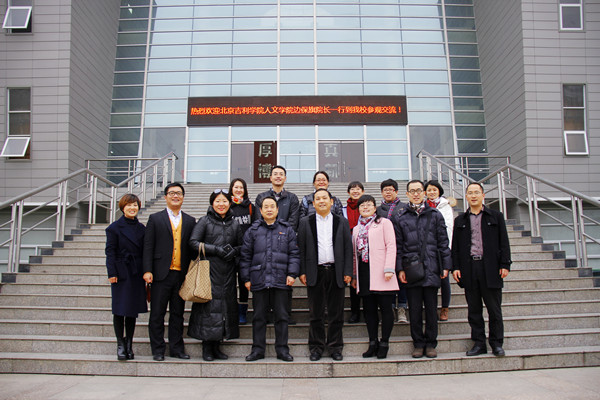 本网讯(通讯员:马兰 学生记者:金典 摄影:程丹 )12月11日,北京吉利学院人文学院院长边保旗一行9人来beat365网登参观交流。beat365网登文化与新闻传播学院执行院长翟荣兵、顾问谢昭新教授、副院长孙鹏飞,外国语学院执行院长邵玲、院长助理杨艳霞等参加了交流活动。