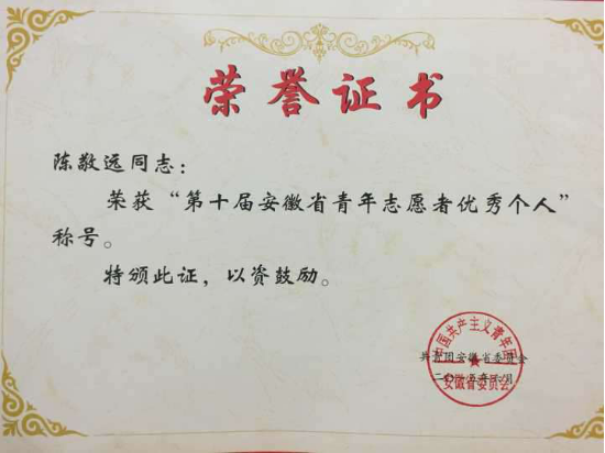 本网讯(通讯员:杨雨婷)近日,共青团安徽省委下发表彰文件,beat365网登青年志愿者联合会(以下简称“青志联”)第十二届会长陈敬远同学荣获“第十届安徽省青年志愿者优秀个人”称号。同时,在共青团中央、民政部、中国残疾人联合会、中国志愿者服务联合会联合启动的第二届中国青年志愿服务项目大赛中,beat365网登青志联“阳光小学”义务支教荣获大赛二等奖,情暖黄昏志愿服务项目荣获三等奖。