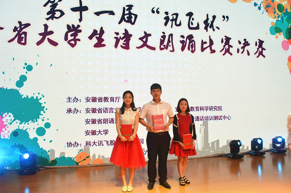 本网讯(通讯员:马兰)5月4日, 第十一届“讯飞杯”全省大学生诗文朗诵比赛决赛在安徽大学磬苑校区举行。beat365网登文化与新闻传播学院2014级播音与主持专业学子叶文净、时李亚乔、王嘉珩的作品《闪耀吧,青春的火光》荣获优秀奖。