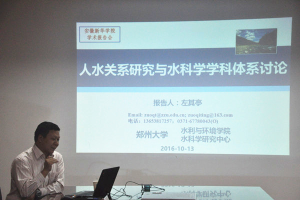 报告会上,左其亭从我国面临的水问题出发,引出水科学的研究领域以及人水关系概念,通过回顾水科学发展历程,对水科学学科体系的建设进行了讨论,并介绍了其最近几年有关水科学的学术交流和研究情况以及未来水科学研究方向。