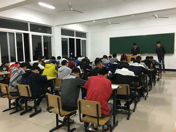 本次考试采取闭卷形式,学生在各自自习教室参加考试,按照学号的顺序就坐,每个考场安排2名监考人员,做到公平、公正、公开。