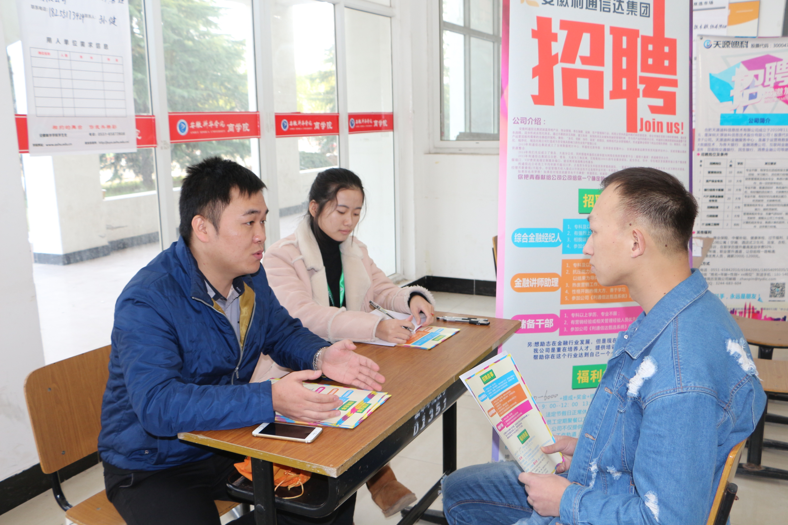 本网讯(通讯员:孙珊珊)为拓宽毕业生就业渠道,进一步推进毕业生就业工作开展,12月1日,商学院举办毕业生冬季专场招聘会。本次招聘会有中国平安集团、宝供物流企业集团有限公司合肥分公司、中国邮政速递物流股份有限公司合肥分公司等多家知名企业公司参加,吸引了500名毕业生前来应聘。