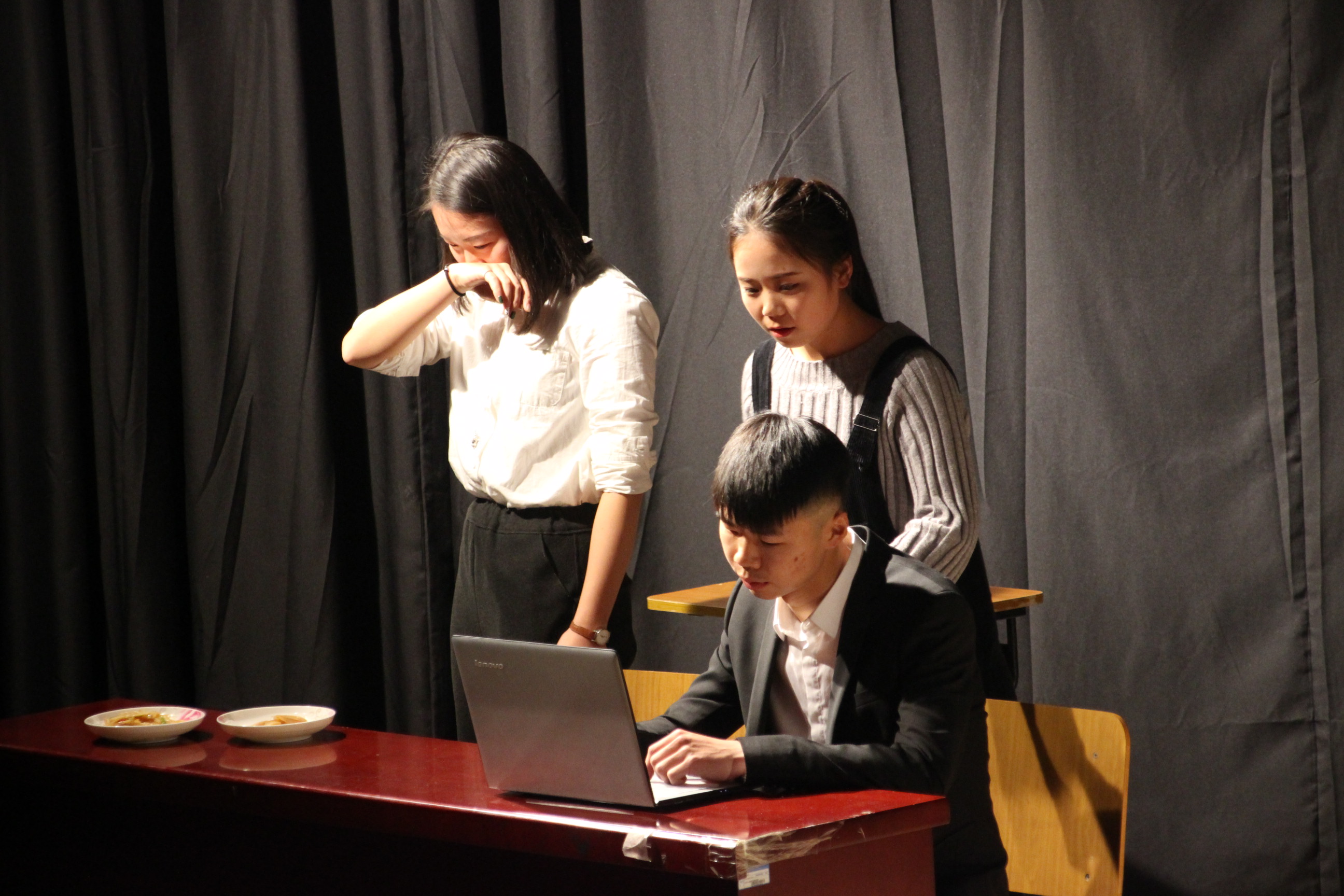 表演艺术的基本功体现在“声”“台”“形”“表”四个方面,学生们精心策划,结合当今社会热点话题,将声乐、台词、形体和表演的基本元素融入整场演出。轻松诙谐的小品《手机综合症》将生活中的“手机控”演绎得惟妙惟肖,让观众在开怀大笑时不忘反思;《人的一生》展现了人在青年、中年和老年的不同状态,也生动刻画了一个家庭从无到有、从和睦到争吵最后回归到生活平静的真实情境;《吹牛练习》《配音秀》等节目展示了学生们的语言基本功和台词功底;《哑剧》《杀死麦赛尔夫》体现了表演专业的特殊魅力;琵琶弹奏、现代舞蹈等才艺展示也体现了当代大学生的综合素质;最后的创意节目《天地日月指》展示了中国传统戏曲的身段,站相、台步、指掌、云掌、亮相等动作可以看出表演者的一举一动都有尺寸,一看一望都有规定。