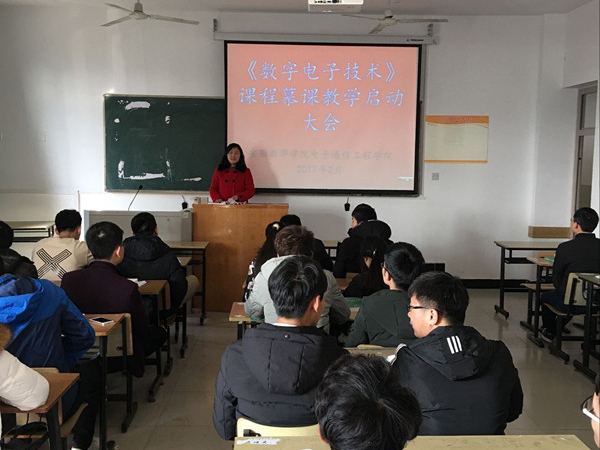 随后,课程建设负责人纪利琴向学生介绍了什么是慕课、《数字电子技术》课程开设慕课的具体情况以及一些具体要求。她强调,开课的过程中采用“SPOC+翻转课堂”的教学方式,要求学生在开课之前必须首先在慕课平台“e会学”上注册账号,在翻转课堂之前必须学习课程的相关内容等。