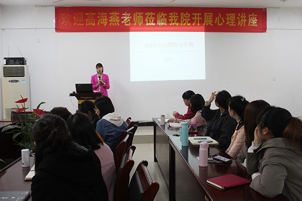 讲座中,高海燕老师分别从自杀的分类、自杀的危险因素、自杀的预防性因素、自杀的预防和评估等方面,结合自身工作经验,充分利用心理危机干预的理论研究、个案实践和权威研究数据,对大学生自杀的原因和身心特征进行了详细分析,并就如何识别和预防大学生心理危机作了专业讲解。除此之外,她还重点讲解了辅导员该如何去帮助危机中的学生,引导他们选择一个健康阳光的生活方式。讲座结束后,高海燕与参会的辅导员进行了现场互动与交流。她强调大学生心理健康的预防重在学生自身,学生要注意自我调节、自我控制、自我疏导。同时,辅导员也要注意关心学生、引导学生,保证学生身体和心理的双健康。最后,她还提醒大家一旦遇到危机,可拨打面向全国24小时免费自杀危机干预热线,咨询详情。