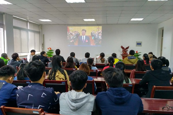 本网讯(通讯员:刘刚)2017年10月18日上午,中国共产党第十九次全国代表大会在北京隆重开幕,动漫学院师生党员、各班级干部及学生代表在动漫学院会议室参加观看直播。