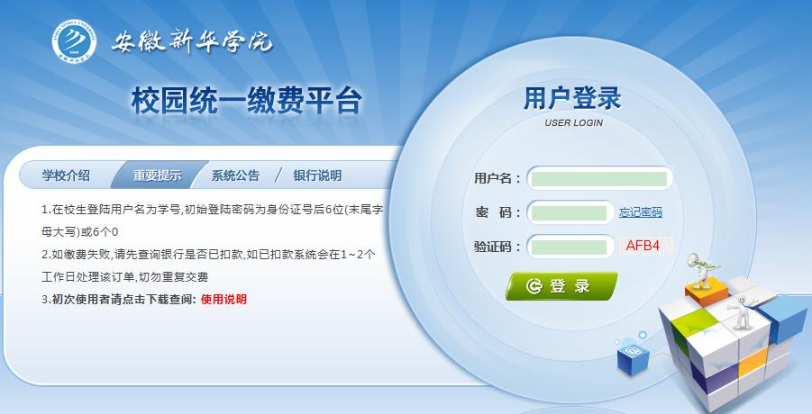 (2) 输入用户名、密码及验证码后登陆“缴费平台”。(参考下图)