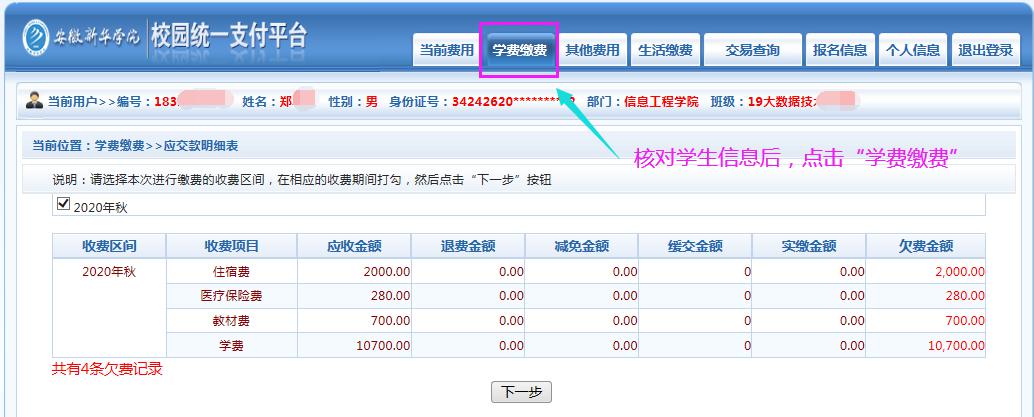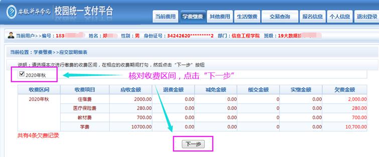 (4) 核对收费区间“2020年秋”,然后点击“下一步”。(参考下图)