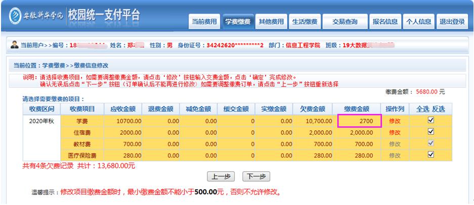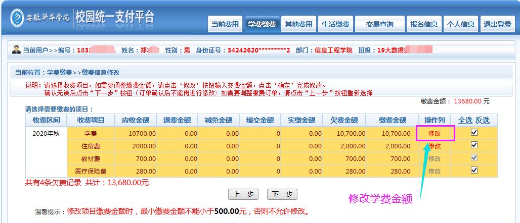 (5) 修改学费缴纳金额(申请助学贷款的同学,请按照扣除助学贷款后的金额进行修改;未贷款的同学,无需修改),点击“确认”,无误后点击“下一步”。(参考下图)