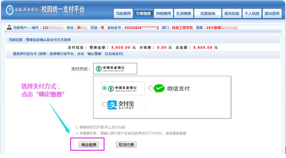 (3) 输入【用户名】及【密码】——【登录】——【学费缴费】——核对并修改学费金额(修改学费金额:办理助学贷款的学生直接按照扣除助贷后的金额进行修改)——【缴】——任意选择一种支付方式(农业银行;微信支付)——【确认支付】——输入密码,缴费