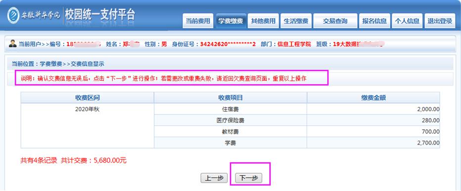 (6) 再次确认缴费信息后点击“下一步”。(参考下图)