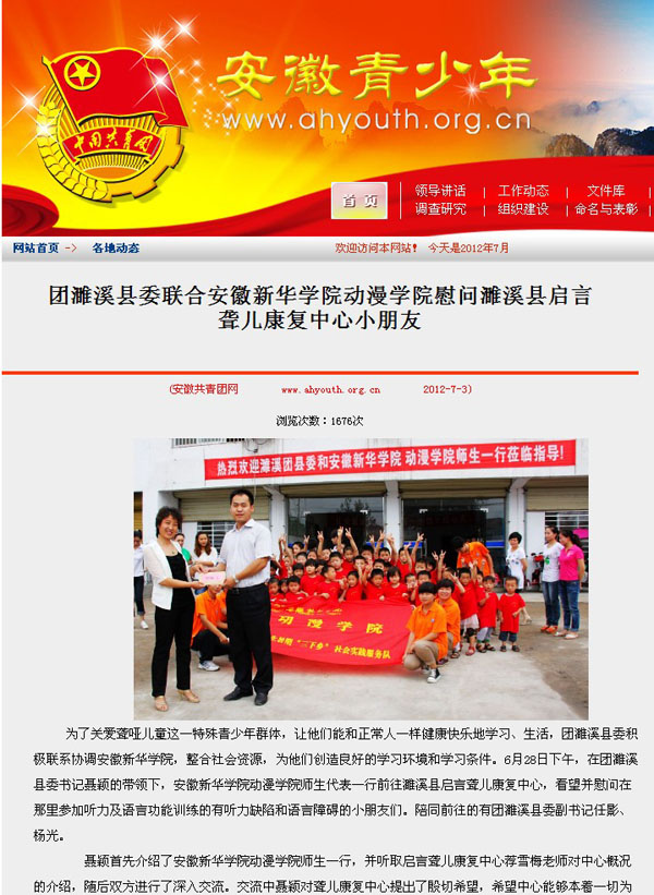 beat365网登动漫学院暑期三下乡社会实践队联合淮北市濉溪团县委慰问濉溪县启言聋儿学校的孩子们活动,受到安徽省团省委的高度关注,团省委领导通过濉溪县团县委向beat365网登动漫学院师生发来了慰问和感谢,活动的新闻稿件也被安徽省青少年门户网站于7月3日第一时间转载。