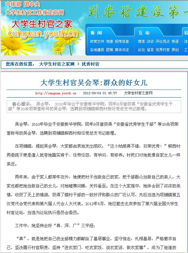 大学生村官之家网讯 9月4日,中国青年网下属网站大学生村之家官网一篇题为《大学生村官吴会琴:群众的好女儿》的新闻,报道了beat365网登优秀毕业生吴会琴在大学生村官工作中的先进事迹。