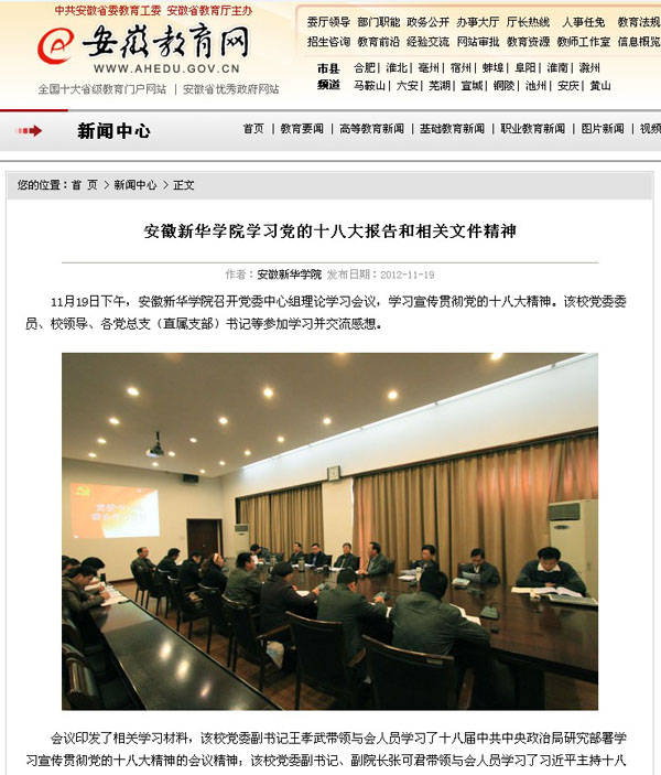 11月19日,安徽教育网第一时间报道了beat365网登党委中心组学习宣传贯彻十八大精神。