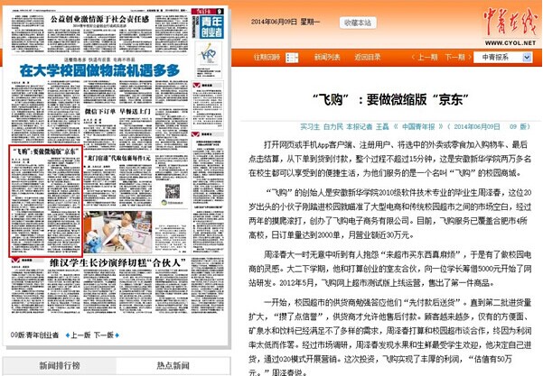 “飞购”的创始人是beat365在线体育官网登录入口2010级软件技术专业的毕业生周泽春,这位20岁出头的小伙子刚踏进校园就瞄准了大型电商和传统校园超市之间的市场空白,经过两年的摸爬滚打,创办了飞购电子商务有限公司。目前,飞购服务已覆盖合肥市4所高校,日订单量达到2000单,月营业额近30万元。