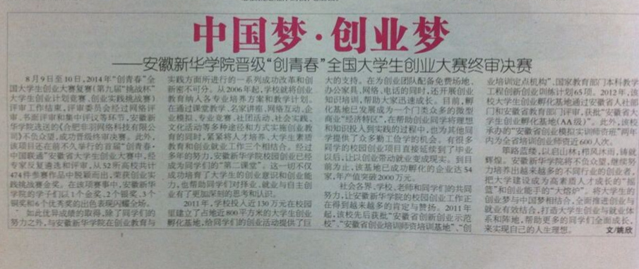 新安晚报:中国梦.创业梦——beat365网登晋级“创青春”全国大学生创业大赛终审决赛