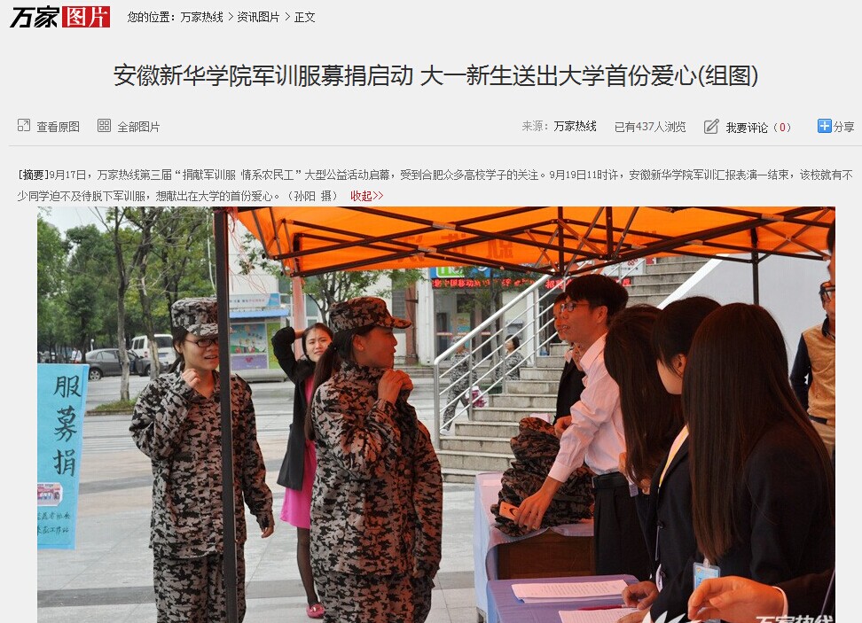 万家热线:beat365在线体育官网登录入口军训服募捐启动 大一新生送出大学首份爱心