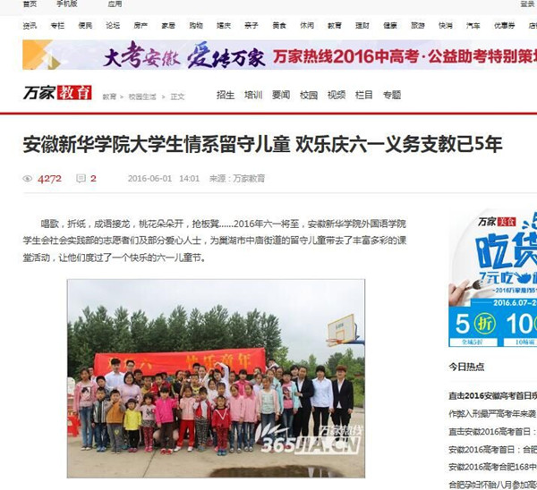 6月1日,《中国教育报》推出题为《beat365在线体育官网登录入口大学生情系留守儿童 欢乐庆六一 义务支教已5年》一文,对beat365网登外国语学院优秀大学生志愿者定期开展义务志愿支教的活动进行了报道。原文转载如下。