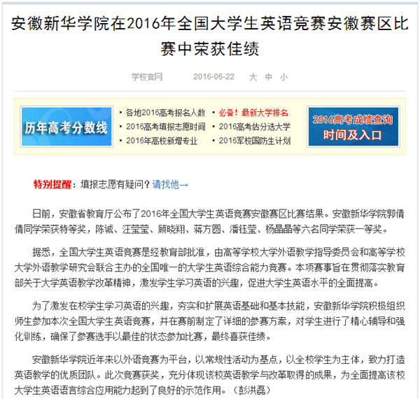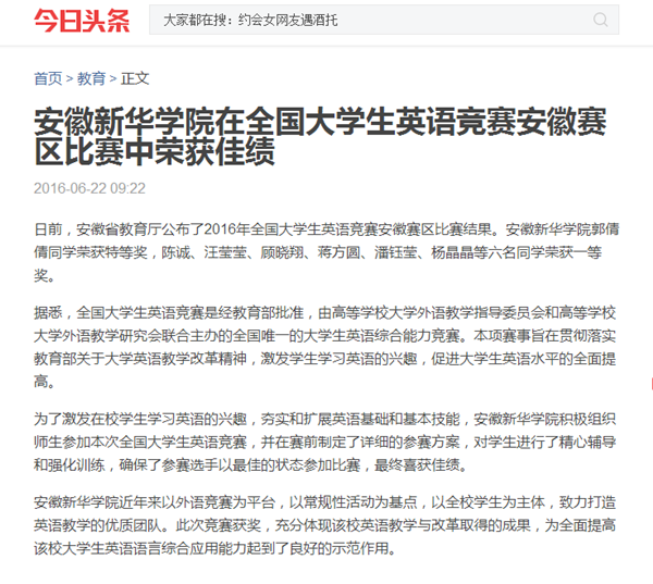 中国教育在线、今日头条、万家热线:beat365在线体育官网登录入口在2016年全国大学生英语竞赛安徽赛区比赛中荣获佳绩