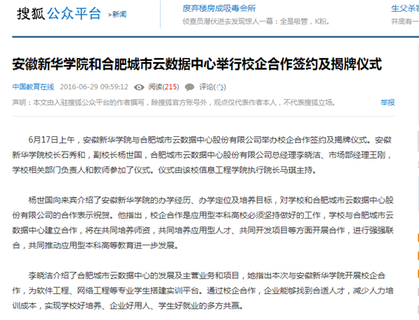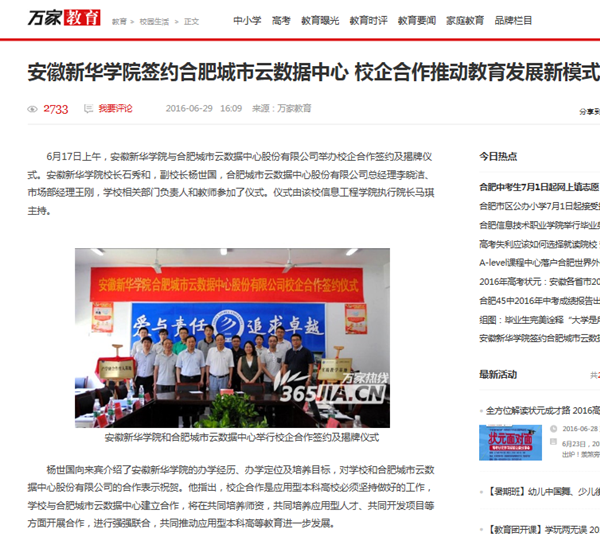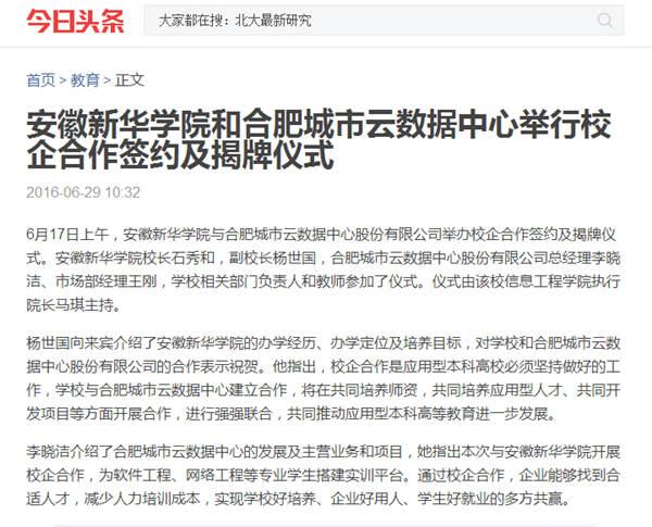 今日头条、搜狐网、万家热线:beat365在线体育官网登录入口和合肥城市云数据中心举行校企合作签约及揭牌仪式