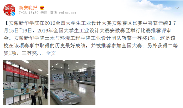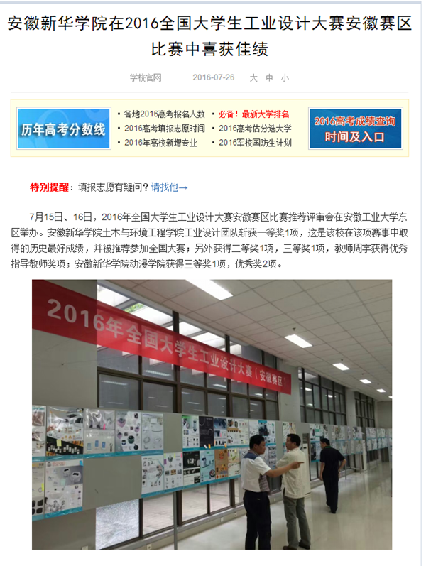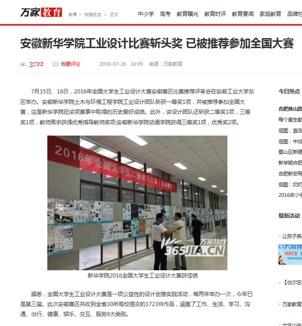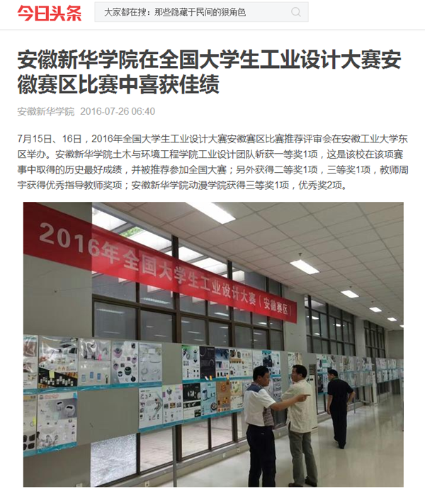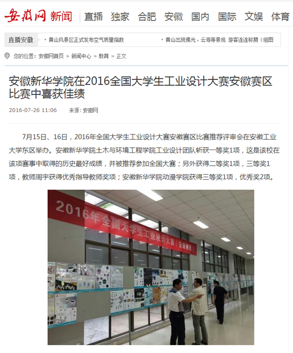 中国教育在线、今日头条、安徽网、万家热线、UC头条、新安晚报微博:beat365在线体育官网登录入口在2016全国大学生工业设计大赛安徽赛区比赛中喜获佳绩