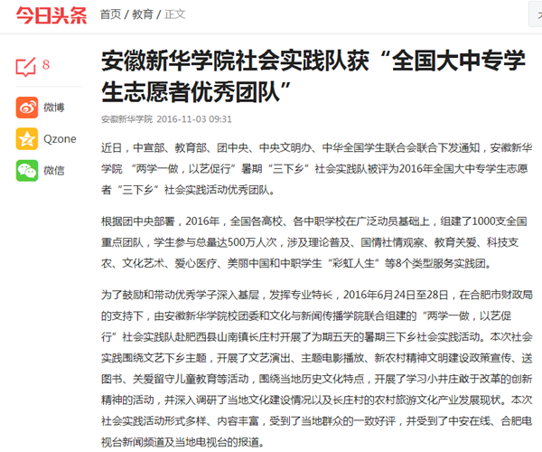 今日头条:beat365在线体育官网登录入口社会实践队获“全国大中专学生志愿者优秀团队”